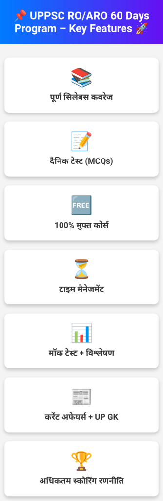📢 यह 60-दिनीय कार्यक्रम आपको UPPSC RO/ARO परीक्षा में अधिकतम स्कोर प्राप्त करने में मदद करेगा। अब देर मत कीजिए, अपनी तैयारी शुरू करें और सफलता की ओर पहला कदम बढ़ाएँ! 🚀